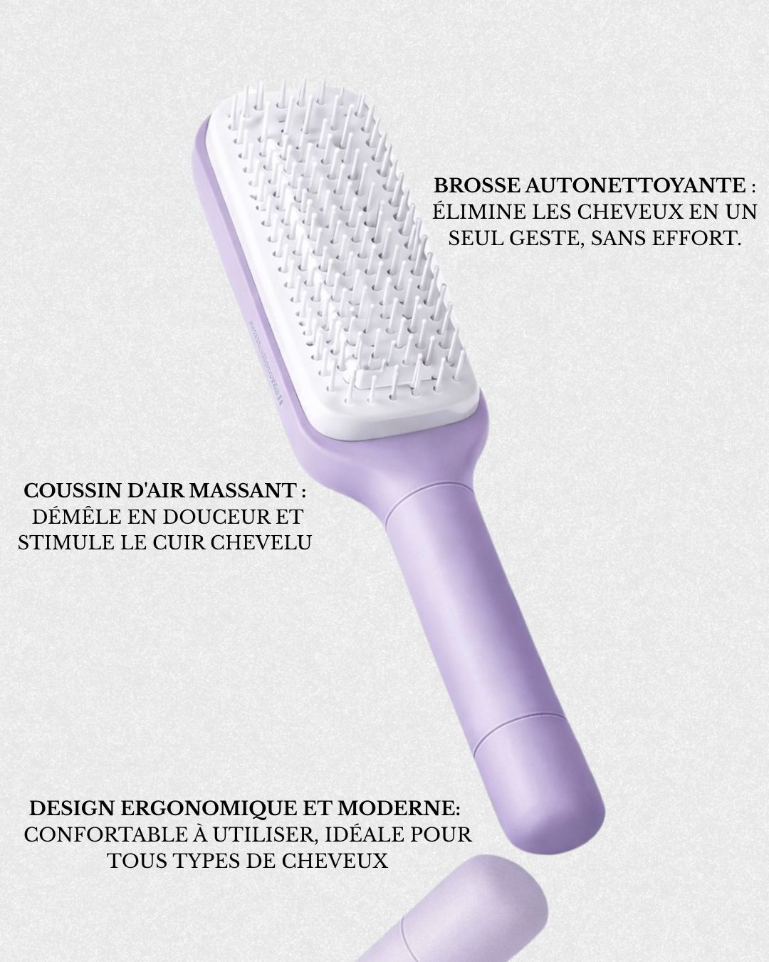 Fabriquée en matériau TPE de haute qualité, la brosse autonettoyante est conçue pour être antistatique. Elle offre un brossage fluide sans frisottis ni électricité statique, tandis que les picots souples massent délicatement le cuir chevelu, favorisent la circulation sanguine et réduisent la casse des cheveux.